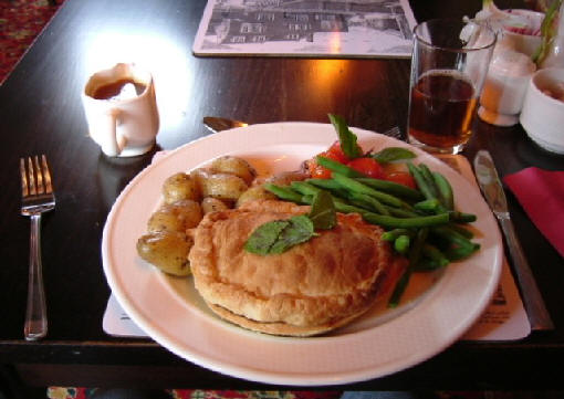 英国の風物を書いた本では、イギリスのパブではぬるいビールをちびちび飲む、などとよく言われている。 いわゆるビターというやつである。日本のビールはラガーというタイプで、炭酸が強く冷やして飲むが、ビターは炭酸が少なく、あまり冷やさないで飲むタイプなのである。 ビターを1パイント、そしてキドニーパイ(牛の腎臓と肉のシチューをパイで包んだもの)を頼む。 この世は極楽である。 |
