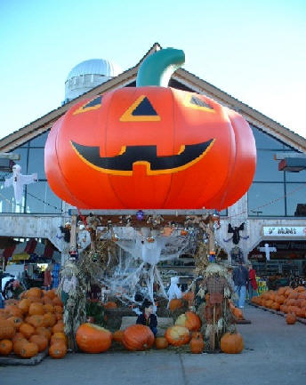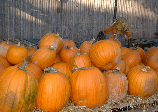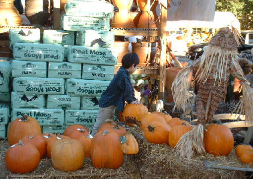 上の写真は、畜産物を中心に扱うNY近郊のスーパーマーケットでのハロウィーンの飾りである。Jack-o'-lantern以外にも、"Boo"と呼ばれるお化けの人形や、案山子(Scarecrow)等が置かれている。 他の写真は、もっとこじんまりしたFarmer's Marketという、農家の直営に近い感じの店である。小さいカボチャから、子供では抱えきれない程のカボチャまで売られている。